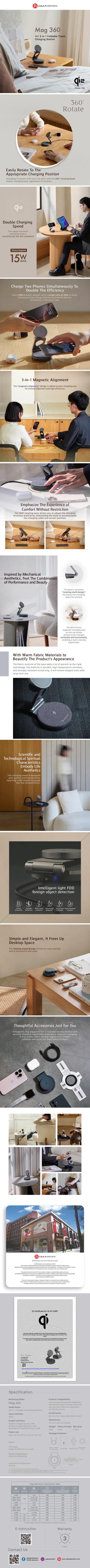 • Highlights • 3-in-1 Foldable Magnetic Charging Stand, simultaneously supports iPhone, Apple Watch, AirPods, and also supports AirPods with MagSafe magnetic charging case. It offers three charging modes, allowing for unrestricted collocation. • Qi2 Module 15W charging, the charging speed is doubled. • Unique dual 15W charging design allows for fast charging of two phones simultaneously. Whether it's iPhone or Android devices, both are supported for an efficient charging experience. • The charging dock features a 360-degree rotating design, ensuring stability and preventing it from tipping over. • Adjustable magnetic charging area provides the best visual experience, whether browsing messages or watching videos. • Metal finish reflecting superior craftsmanship, not only offers a charging experience but can also blend into any living space or office environment. • Built-in foreign object detection mode protects your phone and metal objects from electromagnetic damage and offers overcharge, overheat, and short-circuit protection.