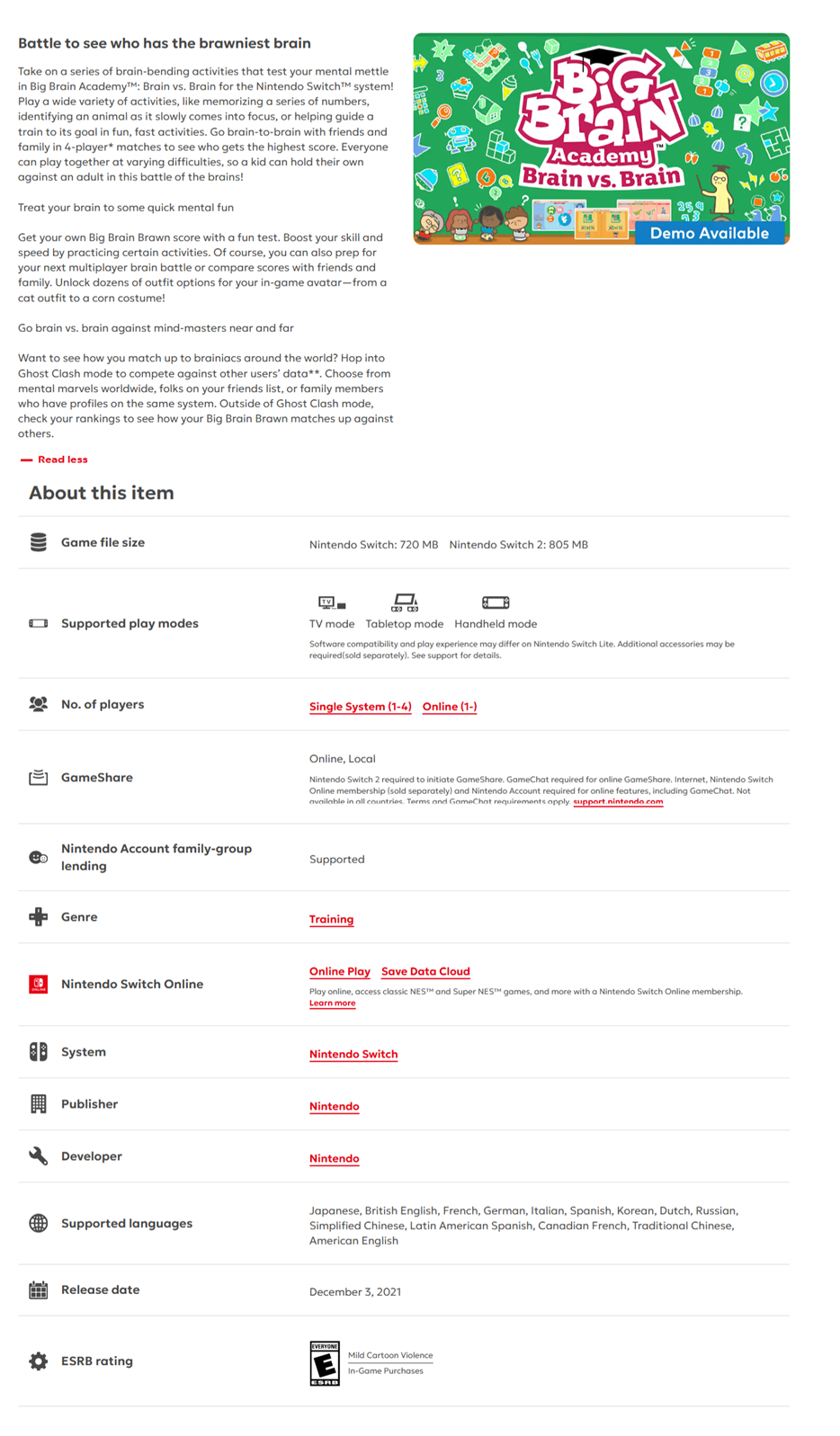 • Highlights •Fun brain training activities across memory, logic, math, and more •Compete with friends and family in multiplayer brain battles •Single-player mode to improve skills at your own pace •Daily exercises to track and enhance mental performance •Suitable for all ages – family-friendly educational gameplay •Simple controls and engaging mini-games •Physical game edition compatible with Nintendo Switch console