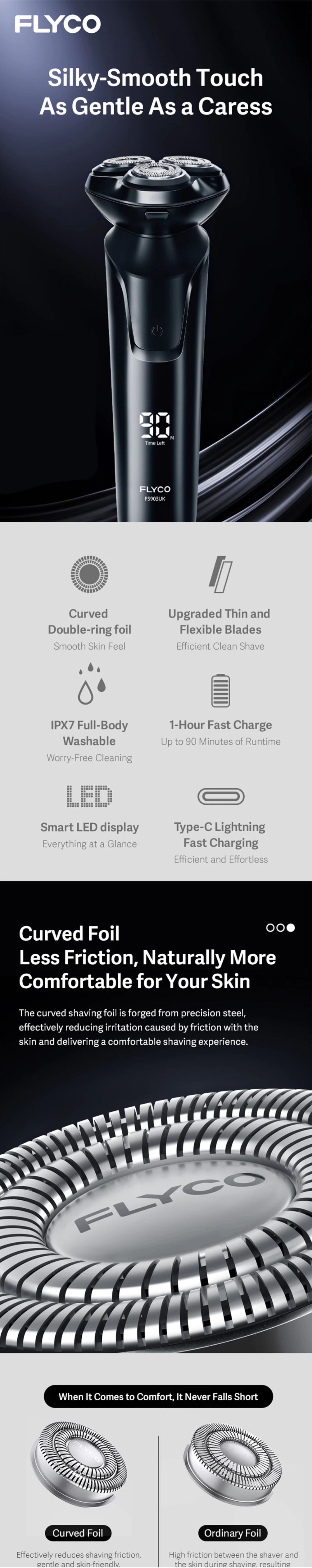 • What's in the Box 1 × Flyco FS903UK Electric Shaver (Smart Sensor Rotary),1 × USB Charging Cable,1 × Cleaning Brush,1 × Protective Cap / Blade Cover,1 × User Manual