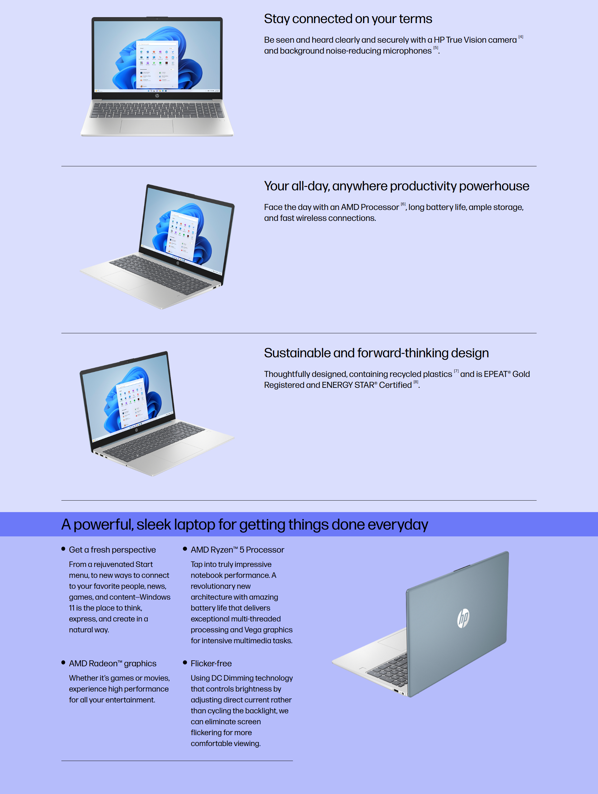 • Highlights • Processor: AMD Ryzen™ 5 7430U Processor • Memory: 16 GB DDR4 3200 MHz RAM (2 x 8 GB) • Storage: 512 GB PCIe® NVMe™ M.2 SSD • Color: Moonlight Blue • Graphics: AMD Radeon™ Graphics • Ports: 1 x USB Type-C® 5Gbps signaling rate 2 x USB Type-A 5Gbps signaling rate 1 x AC smart pin 1 x HDMI 1.4b 1 x headphone/microphone combo • Display: 15.6-inch FHD (1920 x 1080), IPS, micro-edge, anti-glare, 300 nits, 45% NTSC • Connectivity: MediaTek Wi-Fi 6E MT7922 (2x2) and Bluetooth® 5.3 wireless card (supporting gigabit data rate) • Keyboard: Full-size, backlit, soft grey keyboard with numeric keypad • Operating System: Windows 11 Home • Warranty: 2 Years HP Onsite Warranty • Include: HP Backpack • Preinstalled: Microsoft Office Home 2024 + Microsoft 365 Basic