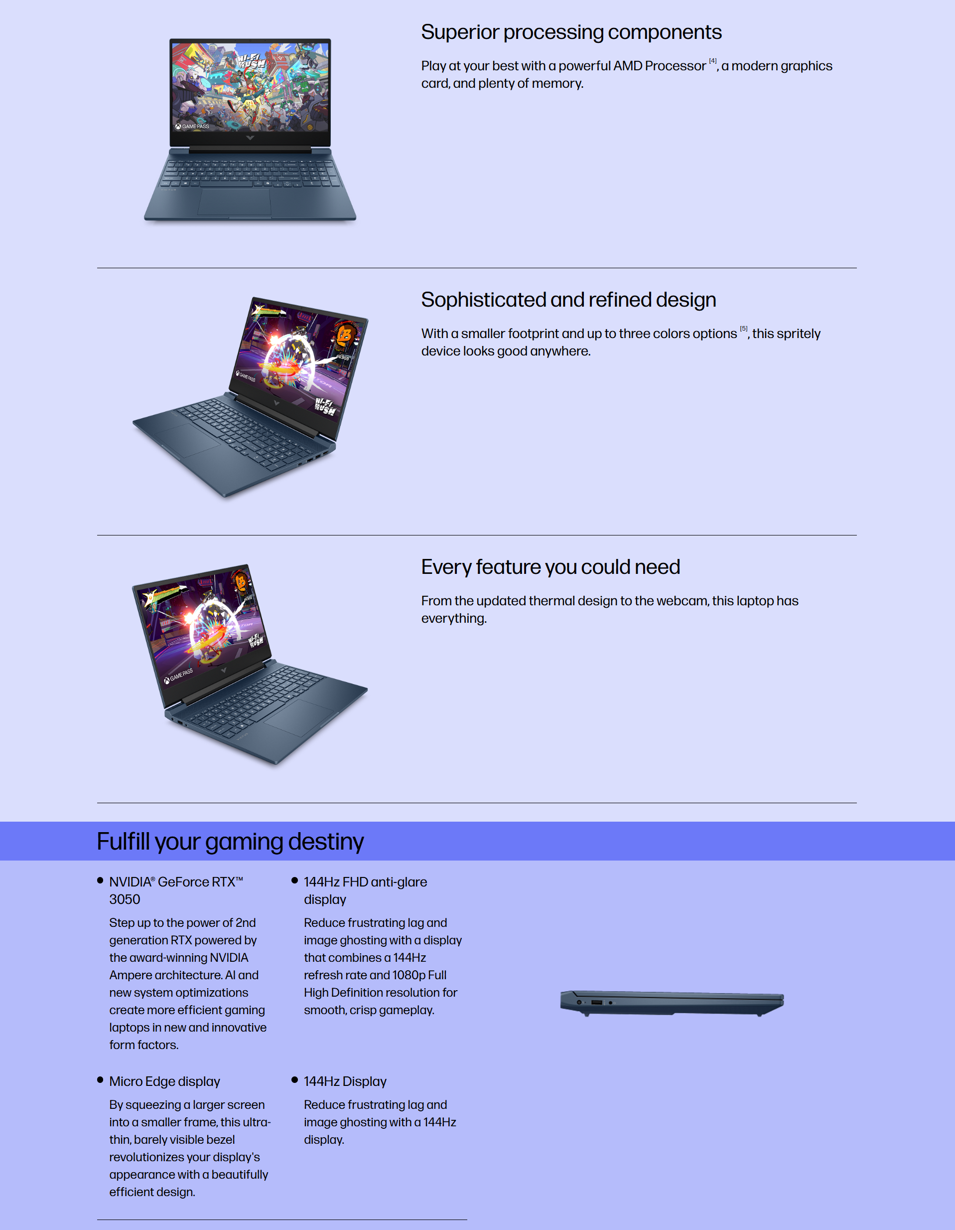 • Highlights • Processor: AMD Ryzen™ 7 7445HS Processor • Memory: 8 GB DDR5-5600 MHz RAM (1 x 8 GB) • Storage: 512 GB PCIe® Gen4 NVMe™ M.2 SSD • Color: Performance Blue • Graphics: NVIDIA® GeForce RTX™ 3050 6GB GDDR6 • Ports: 1 x USB Type-A 5Gbps signaling rate (HP Sleep and Charge) 1 x USB Type-A 5Gbps signaling rate 1 x AC smart pin 1 x HDMI 2.1 1 x headphone/microphone combo 1 x RJ-45 1 x USB Type-C® 5Gbps signaling rate (DisplayPort™ 1.4a, HP Sleep and Charge) • Display: 15.6" IPS FHD (300 nits)1920 x 1080 @ 144 Hz, Micro-edge, anti glare, 62.5% sRGB • Connectivity: Realtek Wi-Fi 6 (2x2) and Bluetooth® 5.4 wireless card Miracast® compatible;HP Extended Range Wireless LAN • Keyboard: Full-size, backlit, performance blue opaque keyboard with numeric keypad • Operating System: Windows 11 Home • Warranty: 2 Years HP Onsite Warranty + ADP • Include: HP Backpack • Preinstalled: Microsoft Office Home 2024 + Microsoft 365 Basic