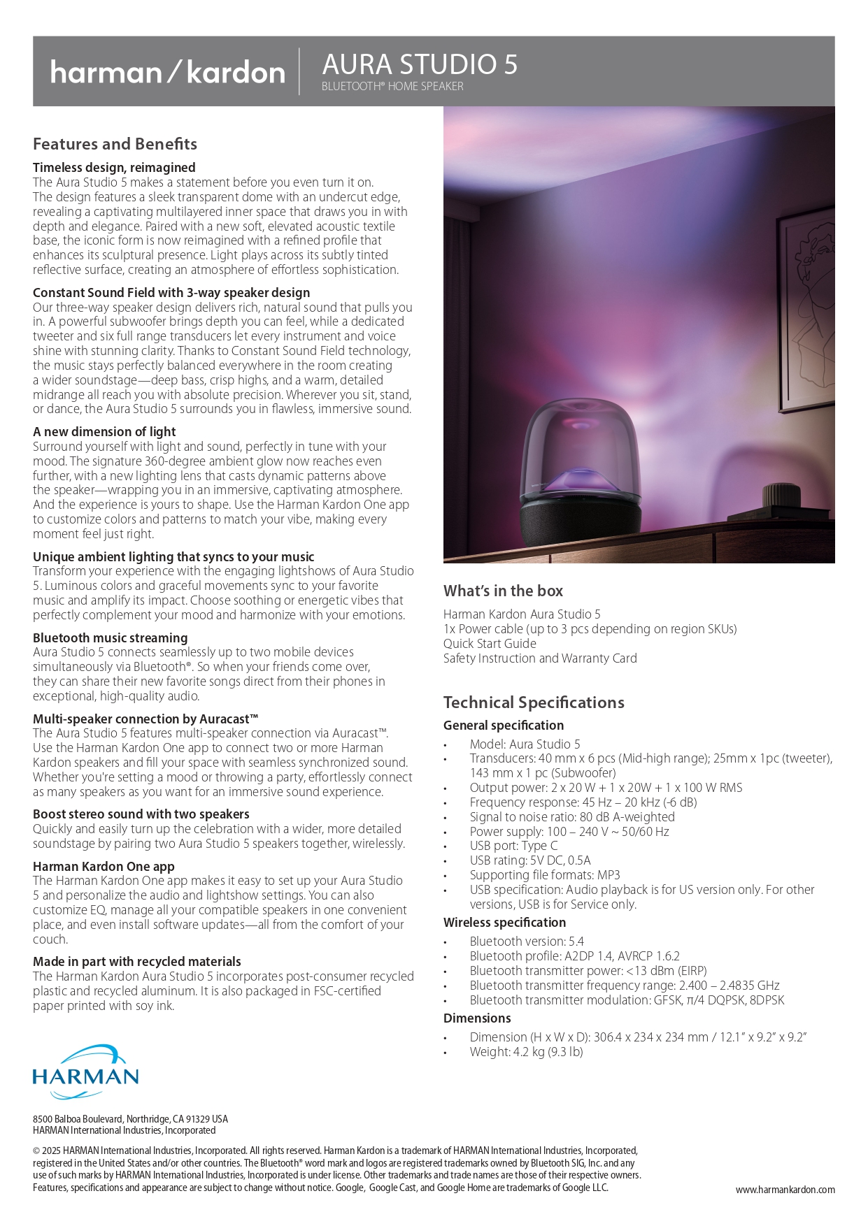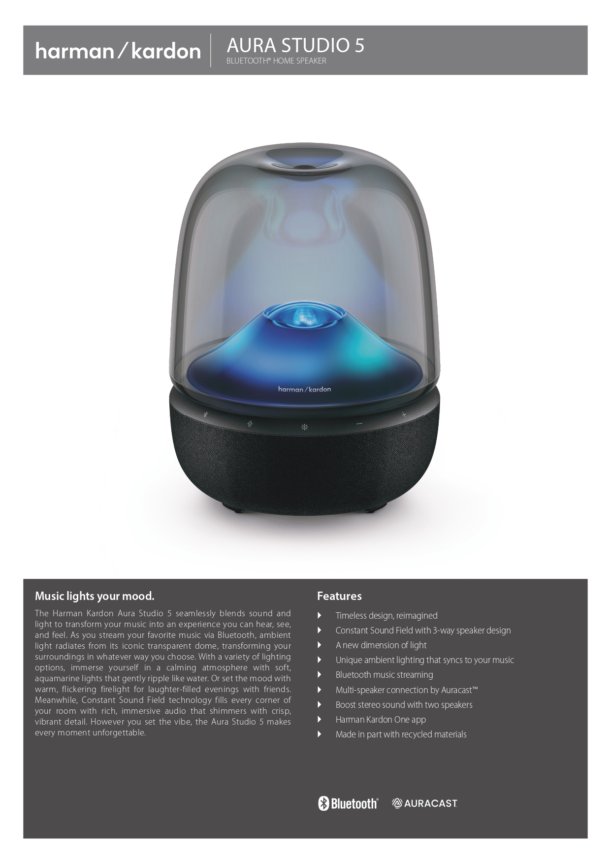 • Highlights • Timeless design, reimagined The Aura Studio 5 makes a statement before you even turn it on. The design features a sleek transparent dome with an undercut edge, revealing a captivating multilayered inner space that draws you in with depth and elegance. Paired with a new soft, elevated acoustic textile base, the iconic form is now reimagined with a refined profile that enhances its sculptural presence. Light plays across its subtly tinted reflective surface, creating an atmosphere of effortless sophistication. • Constant Sound Field with 3-way speaker design Our three-way speaker design delivers rich, natural sound that pulls you in. A powerful subwoofer brings depth you can feel, while a dedicated tweeter and six full range transducers let every instrument and voice shine with stunning clarity. Thanks to Constant Sound Field technology, the music stays perfectly balanced everywhere in the room creating a wider soundstage—deep bass, crisp highs, and a warm, detailed midrange all reach you with absolute precision. Wherever you sit, stand, or dance, the Aura Studio 5 surrounds you in flawless, immersive sound. • A new dimension of light Surround yourself with light and sound, perfectly in tune with your mood. The signature 360-degree ambient glow now reaches even further, with a new lighting lens that casts dynamic patterns above the speaker—wrapping you in an immersive, captivating atmosphere. And the experience is yours to shape. Use the Harman Kardon One app to customize colors and patterns to match your vibe, making every moment feel just right. • Unique ambient lighting that syncs to your music Transform your experience with the engaging lightshows of Aura Studio 5. Luminous colors and graceful movements sync to your favorite music and amplify its impact. Choose soothing or energetic vibes that perfectly complement your mood and harmonize with your emotions. • Bluetooth music streaming Aura Studio 5 connects seamlessly up to two mobile devices simultaneously via Bluetooth®. So when your friends come over, they can share their new favorite songs direct from their phones in exceptional, high-quality audio. • Multi-speaker connection by AuracastTM The Aura Studio 5 features multi-speaker connection via AuracastTM. Use the Harman Kardon One app to connect two or more Harman Kardon speakers and fill your space with seamless synchronized sound. Whether you're setting a mood or throwing a party, effortlessly connect as many speakers as you want for an immersive sound experience. • Boost stereo sound with two speakers Quickly and easily turn up the celebration with a wider, more detailed soundstage by pairing two Aura Studio 5 speakers together, wirelessly. • Harman Kardon One app The Harman Kardon One app makes it easy to set up your Aura Studio 5 and personalize the audio and lightshow settings. You can also customize EQ, manage all your compatible speakers in one convenient place, and even install software updates—all from the comfort of your couch. • Made in part with recycled materials The Harman Kardon Aura Studio 5 incorporates post-consumer recycled plastic and recycled aluminum. It is also packaged in FSC-certified paper printed with soy ink.