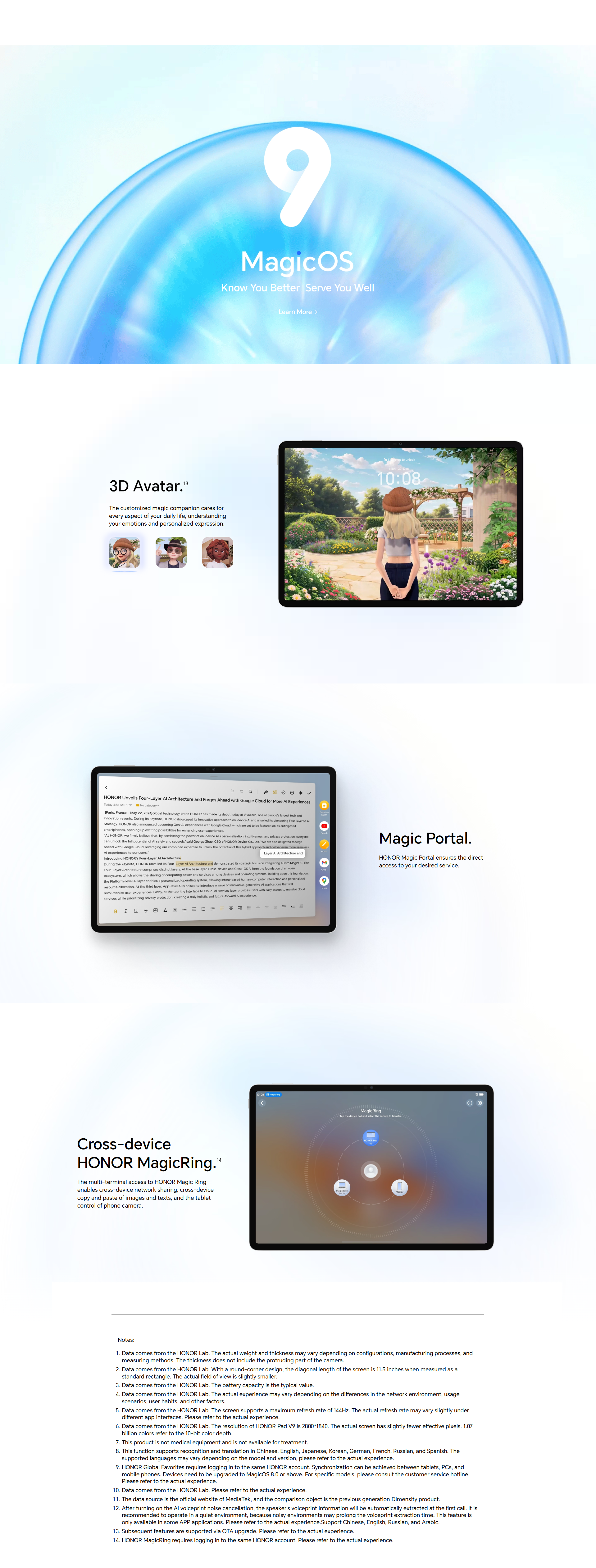 • Highlights •Dimensions Width: 259.1mm Height: 176.1mm Thickness: 6.1mm Weight: Approx 475g (including battery) Note: The actual dimensions may vary slightly according to configuration, manufacturing process, and measurement method. •Display Size: 11.5 inches Note: The display has a rounded corner design, and when measured according to a standard rectangle, the diagonal length of the screen is 11.5 inches (the actual viewing area is slightly smaller) Type: LCD Resolution: 2800*1840 Screen Color: 1.07 billion colors, DCI-P3 Wide color gamut Note:1.07 billion colors refer to 10bit color depth (8bit hardware specification, 2bit is software algorithm extension), the number of colors that can be displayed is 1024×1024×1024 kinds, about 1.07 billion. •Processor CPU model: MediaTek Dimensity 8350 Elite Number of CPU Cores: Octa-core 1 x Cortex-A715 3.35GHz + 3 x Cortex-A715 3.20GHz + 4 x Cortex-A510 2.2GHz •Operating System MagicOS 9.0 (Android 15) •Storage Internal Storage (ROM) 24GB RAM+256GB ROM WiFi (12GB HONOR RAM Turbo included) Note: The available internal storage may be smaller as part of the internal storage is occupied by software. •Camera Rear Camera 13MP camera (Fno2.0 AF) Note: The pixels of photos with different photo modes may vary, please refer to the actual situation. Front Camera 8MP camera (F2.0 FF) Note: The pixels of photos with different photo modes may vary, please refer to the actual situation. •Battery Battery Capacity: 10100 mAh (typical value) Note: The battery has a rated capacity of 10000 mAh Battery Type: Lithium polymer battery •Connectivity Wi-Fi WIFI 6,802.11 a/b/g/n/ac/ax, 2x2 MIMO Wi-Fi Frequency 2.4GHz and 5GHz Bluetooth BT 5.2 Supported BLE, SBC, AAC, LDAC, aptX, aptX HD