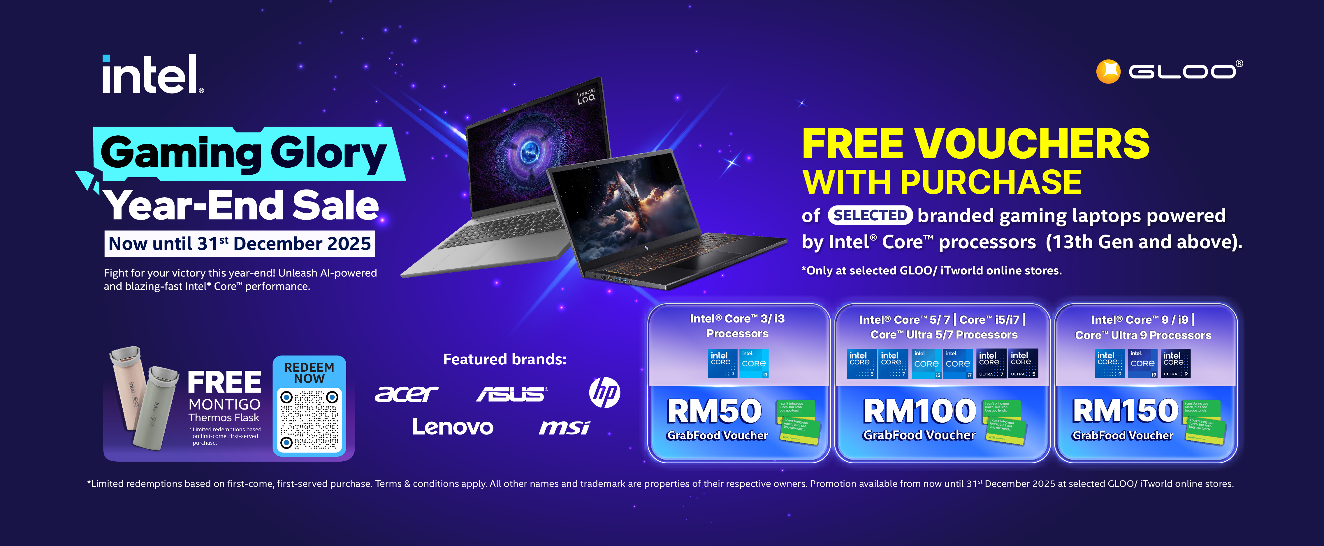 • FREE up to RM150 GrabFood vouchers & Montigo Thermos Flask upon purchase of selected branded gaming laptops powered by Intel® Core™ Processors.(*Limited quantity based on first come first serve basis)