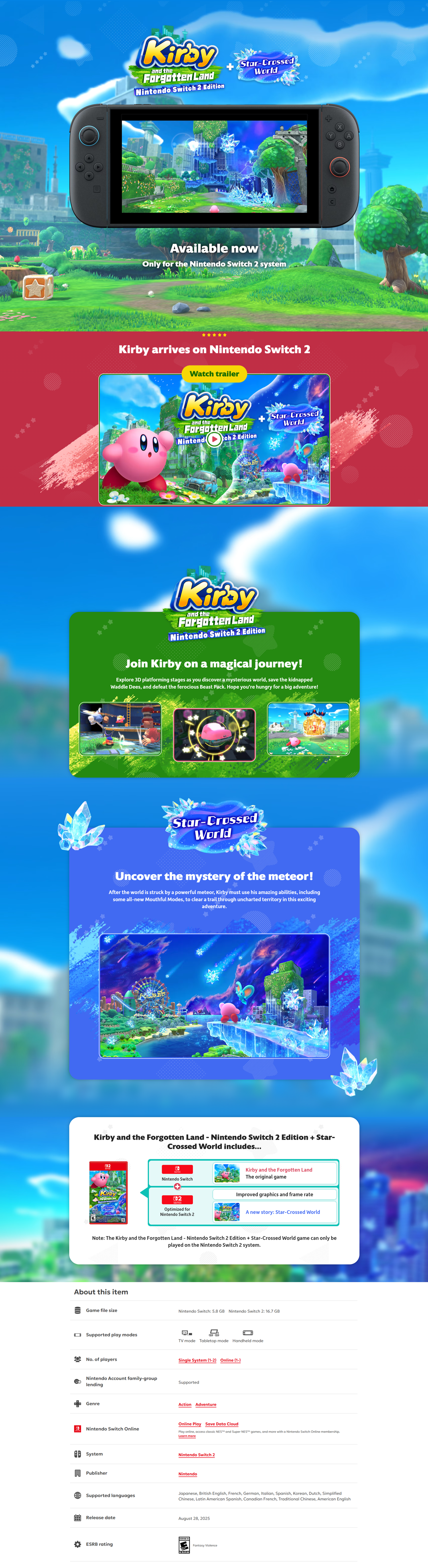 • Highlights •Exciting 3D platform adventure featuring Kirby exploring mysterious post-apocalyptic worlds •Includes Star-Crossed World expansion with new levels, enemies, and challenges •Use Kirby’s copy abilities and unique powers to defeat enemies and solve puzzles •Co-op multiplayer mode – team up with friends for fun cooperative gameplay •Enhanced visuals and smooth performance optimized for Nintendo Switch 2 •Family-friendly gameplay suitable for players of all ages