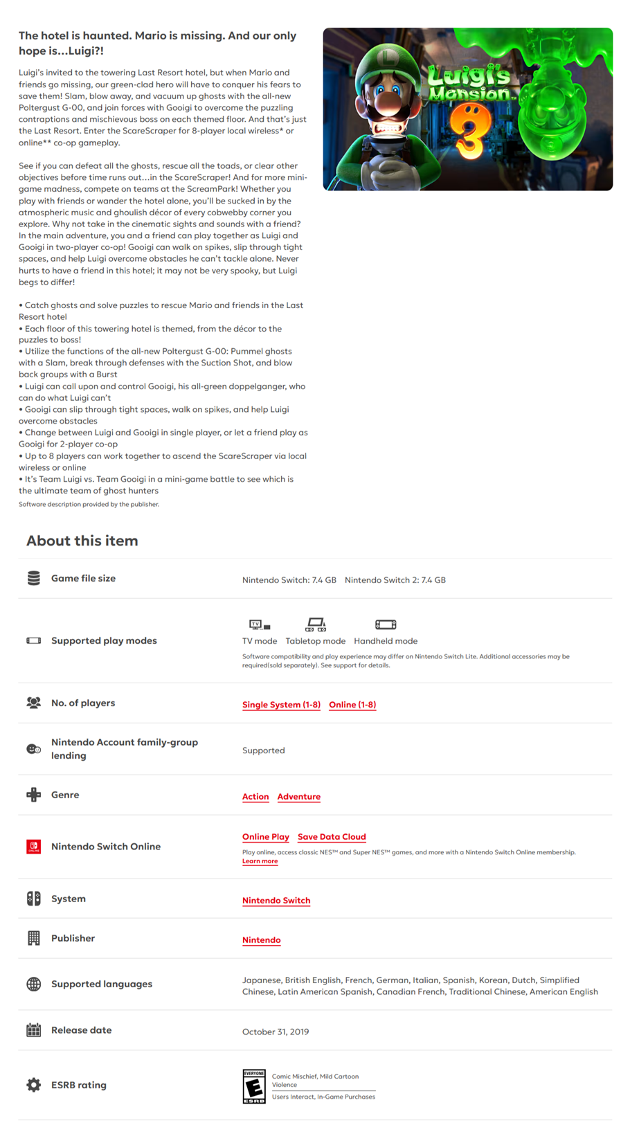 • Highlights •Exciting ghost-hunting adventure starring Luigi •Explore haunted hotels filled with puzzles, secrets, and hidden treasures •Use the Poltergust G-00 to capture ghosts and solve challenges •Single-player and multiplayer modes for cooperative fun •Enhanced graphics and smooth performance optimized for Nintendo Switch •Collect gems, coins, and unlock hidden areas across multiple floors •Physical game edition compatible with Nintendo Switch console