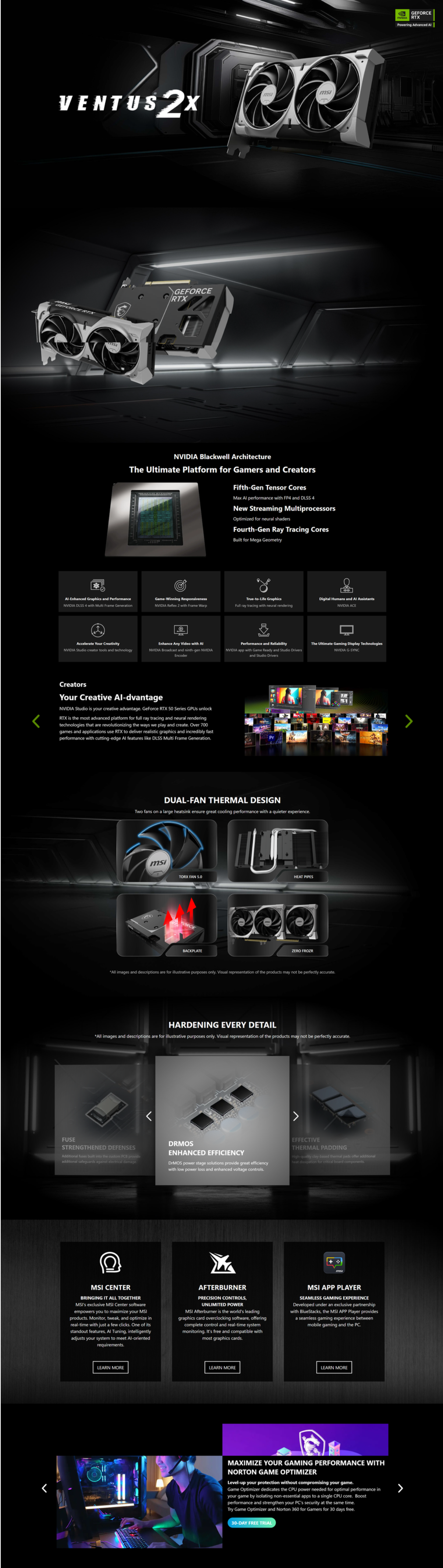 • Highlights •Memory: 8GB GDDR7 •Interface: PCI Express® Gen 5 x16 (uses x8) •Remark: 3 Years Warranty by MSI Malaysia •Graphics Processing Unit: NVIDIA® GeForce RTX™ 5060 •Core Clocks: Extreme Performance: 2535 MHz (MSI Center) •Boost: 2527 MHz •Cuda Cores: 3840 Units •Memory Speed: 28 Gbps •Memory Bus: 128-bit •Maximum Displays: 4 •Digital Maximum Resolution: 7680 x 4320 •Output: 3x DisplayPort (v2.1b) 1x HDMI™ (As specified in HDMI™ 2.1b: up to 4K 480Hz or 8K 120Hz with DSC, Gaming VRR, HDR)