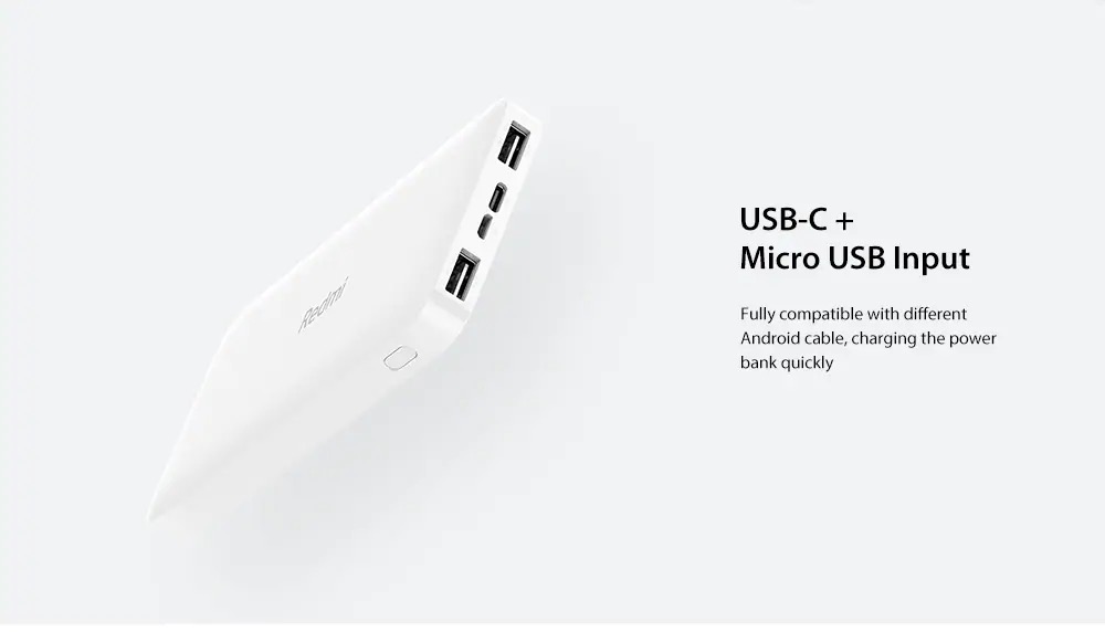 • Package includes: 10000mAh Redmi Power Bank x 1, USB-A to Micro-USB cable x 1, User Manual x 1