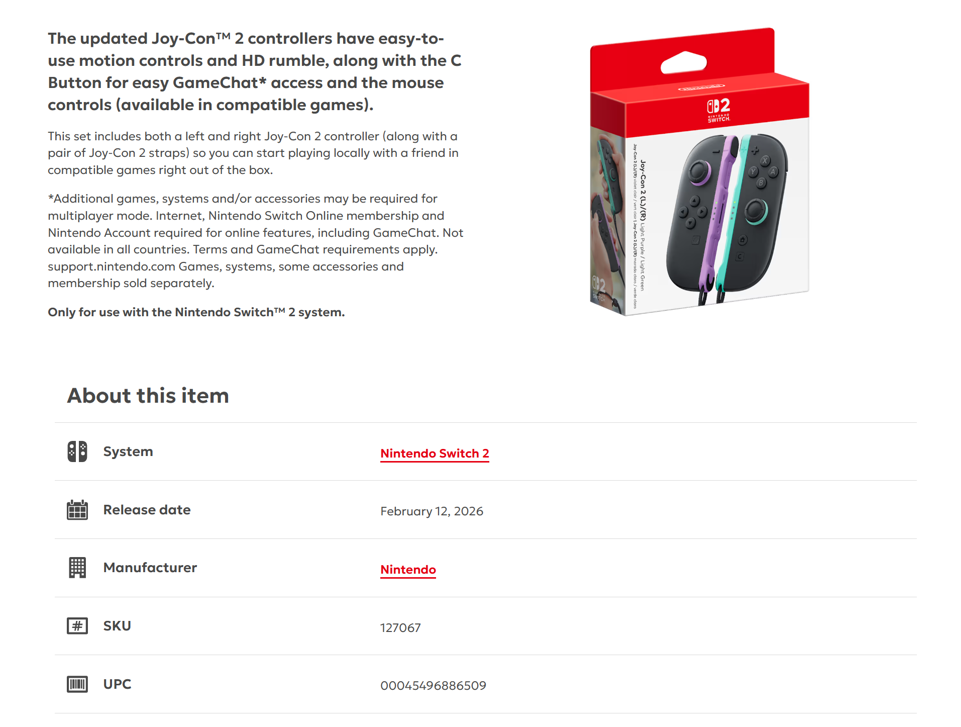 • What's in the Box Left Joy‑Con 2 controller | Right Joy‑Con 2 controller | Pair of Joy‑Con 2 straps