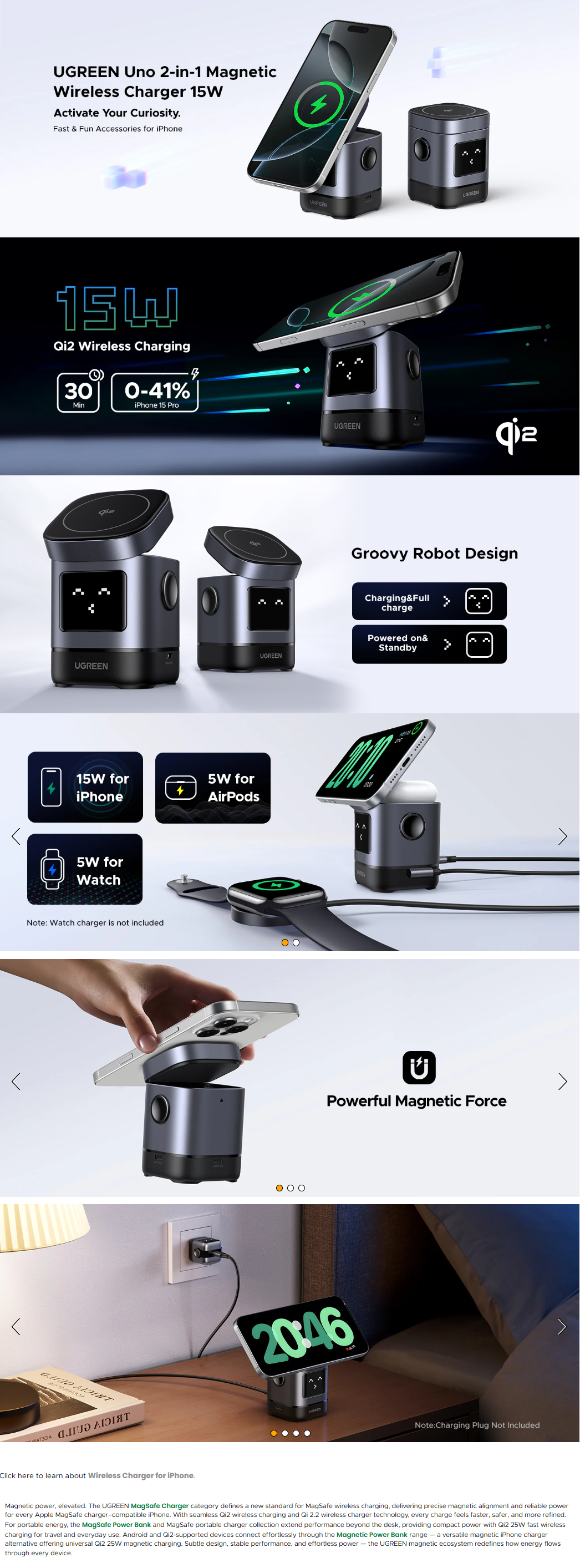 • Highlights • 15W Fast Charging: Charge iPhone up to 41% in 30 minutes. Efficient power for daily use. • Charge 3 Devices at Once: 15W for phone, 5W for earbuds, and 5W USB-C for Apple Watch. • Smart Robot Display: Cute screen expressions make charging more fun • Strong Magnetic Grip: N48H magnets hold your device securely; doubles as a stand. • In the Box: Uno Wireless Charger + 3.3 ft USB-C Cable