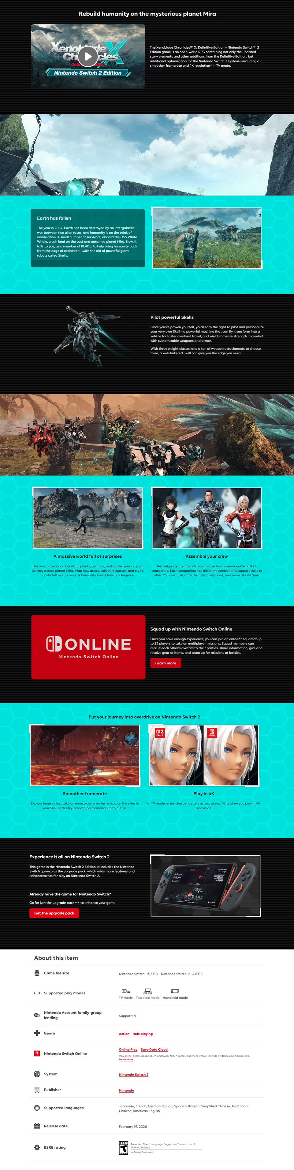 • Highlights •Official Xenoblade Chronicles X: Definitive Edition – Nintendo Switch 2 Edition •Enhanced graphics and performance •Massive open-world sci-fi RPG adventure •Pilot powerful Skells (mechs) •Deep story and character customization •Solo or online multiplayer gameplay