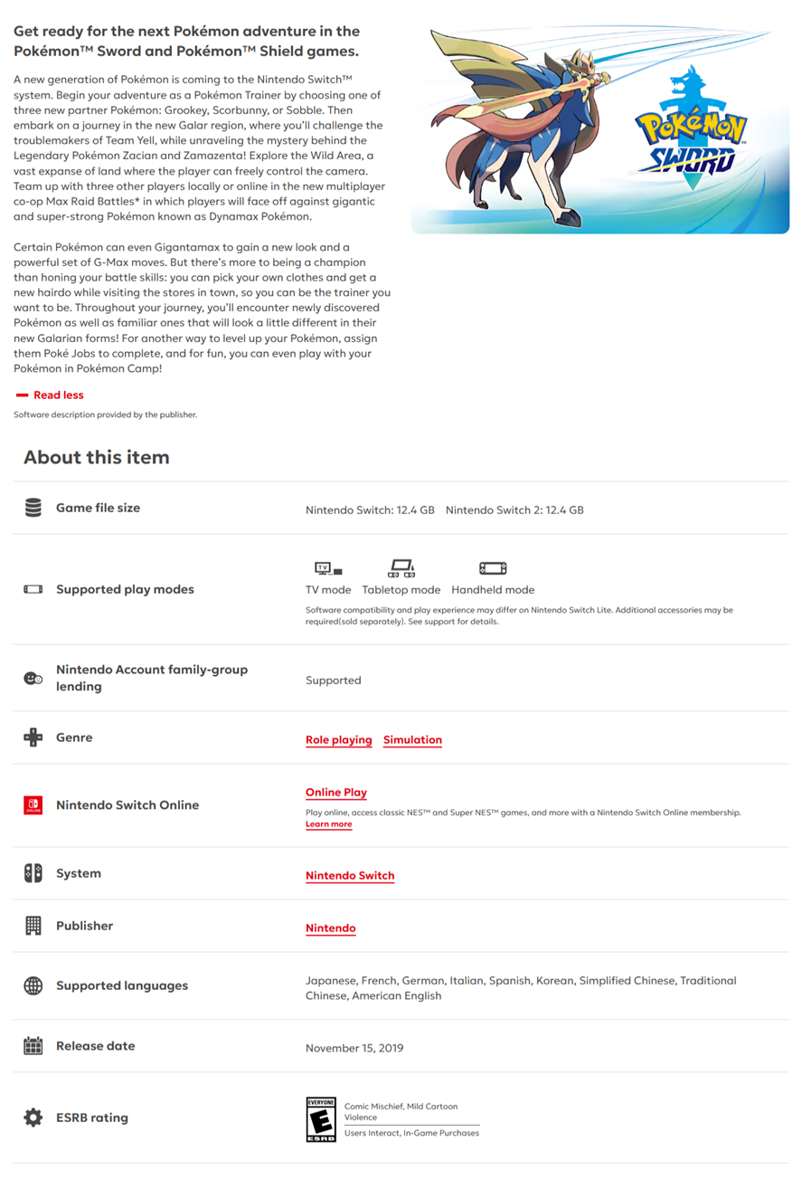• Highlights •Adventure RPG gameplay set in the Galar region •Catch, train, and battle Pokémon to become a champion •Single-player story mode with engaging quests and challenges •Multiplayer battles with friends locally and online •Enhanced graphics and smooth gameplay on Nintendo Switch •Collect items, evolve Pokemon, and unlock legendary creatures •Physical game edition compatible with Nintendo Switch console
