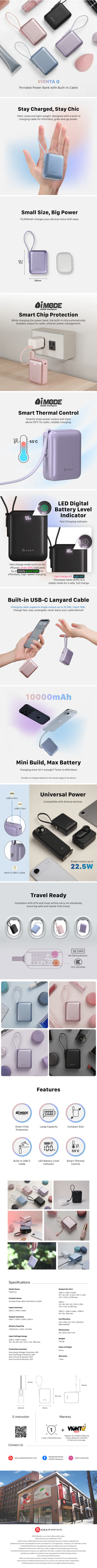 • Highlights • Weighs only 158g and fits right in your palm — lighter than most smartphones. Perfect for travel, commuting, and business trips • 10,000mAh / 38.5Wh high-capacity battery, compliant with international airline carry-on regulations. Safe to take on flights worldwide • Compact yet powerful, capable of providing about 2 full charges for a smartphone, keeping you worry-free day and night • Built-in USB-C fast charging cable, no need to carry extra cables — truly travel light with ease • USB-C / USB-A / Built-in USB-C cable outputs with up to 22.5W fast charging, supporting iPhone, Android, tablets, and earbuds simultaneously • Equipped with four layers of safety protection: over-current, short-circuit, over-voltage, and over-discharge • Reliable for long-term use Certified by CE / FCC / RoHS 2.0 / BSMI / PSE / TISI / CCC, ensuring trusted quality and safety • Available in multiple stylish colors with a woven USB-C lanyard, making it both portable and a trendy accessory