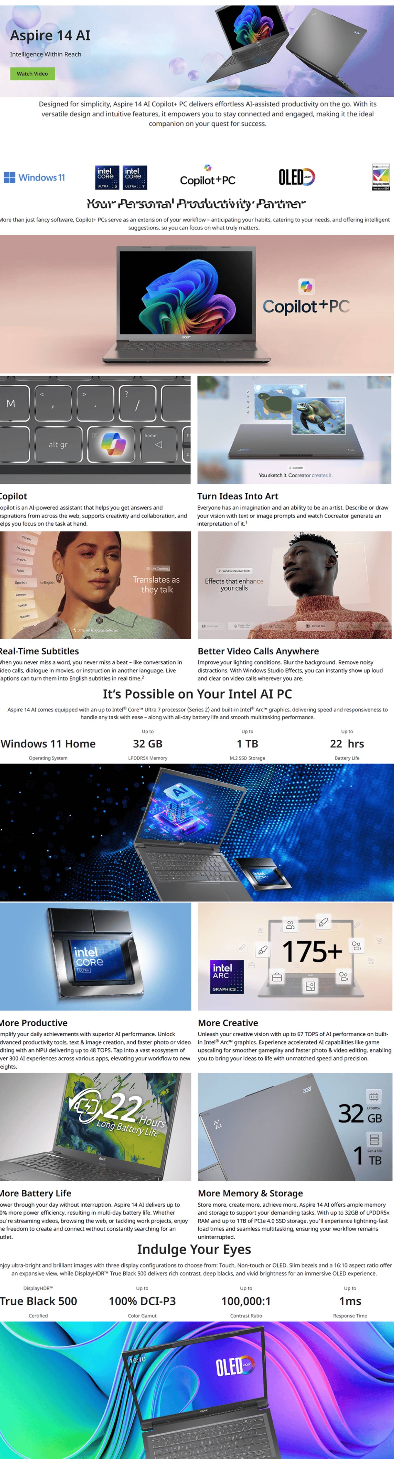 • Name Acer Aspire 14 Ai A14-52M-51NE Laptop (Intel® Core™ Ultra 5 226V | 14" WUXGA | 16GB RAM | 512GB SSD | Intel Graphics | Windows 11 Home | Office Home & Student + Microsoft 365)