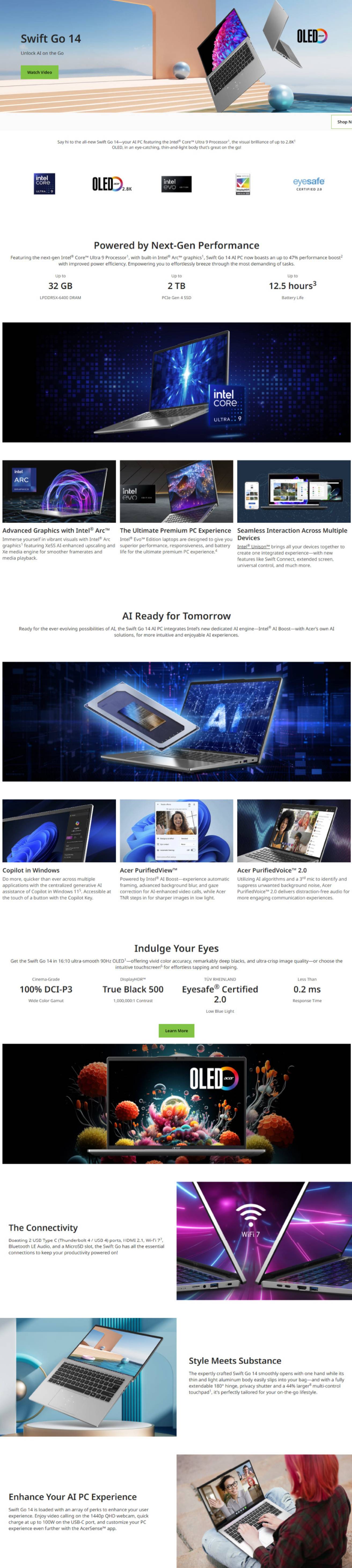 • Name Acer Swift Go 14 SFG14-74T-96C0 Laptop (Intel® Core™ Ultra 9 285H | 14" WUXGA Touch | 32GB RAM | 1TB SSD | Intel® Arc™ Graphics | Windows 11 Home | Office Home & Student + Microsoft 365)